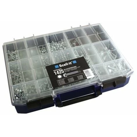 Acier zingué. Composé de 1425 vis autoperceuses tête hexagonale avec collerette crantée et 180 rondelles. Vis : – diamêtre 4,2 x 13 mm (250 pièces), – diamêtre 4,2 x 16 mm (200 pièces), – diamêtre 4,2 x 19 mm (150 pièces), – diamêtre 4,8 x 16 mm (150 pièces), – diamêtre 4,8 x 19 mm (125 pièces), – diamêtre 4,8 x 25 mm (100 pièces), – diamêtre 4,8 x 32 mm (75 pièces), – diamêtre 5,5 x 19 mm (100 pièces), – diamêtre 5,5 x 25 mm (100 pièces), – diamêtre 6,3 x 25 mm (50 pièces), – diamêtre 6,3 x 32 mm (50 pièces), – diamêtre 6,3 x 38 mm (50 pièces), – diamêtre 6,3 x 50 mm (25 pièces). Rondelles : – diamêtre 14 mm (100 pièces), – diamêtre 16 mm (80 pièces).